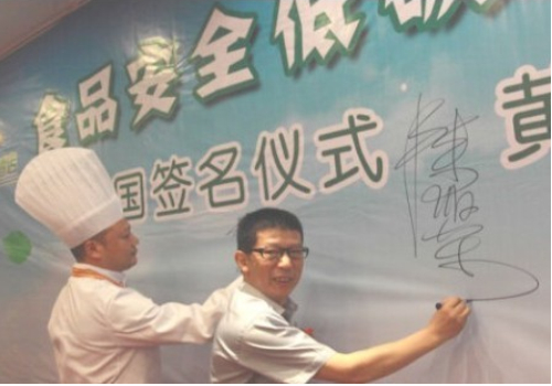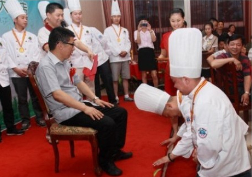 7月10號晚,“當代四大名廚”陳緒榮在湖北黃石陽新舉行了盛大的收徒儀式!收徒儀式由大冶市烹飪餐飲業(yè)協(xié)會常務(wù)副會長兼秘書長羅文主持,黃石市烹飪餐飲業(yè)協(xié)會和大冶市烹飪餐飲業(yè)協(xié)會的眾多嘉賓到場祝賀,北京、江西和武漢等地的弟子專程前來賀喜。首先,我號召同行承諾推廣綠色食材和綠色烹飪的“生態(tài)宴”,并在“食品安全低碳環(huán)保‘生態(tài)宴’”簽名墻上簽字,大家踴躍寫上自己的名字;隨后,收徒儀式以傳統(tǒng)的拜師形式舉行,按跪拜、敬茶、頒發(fā)證書和合影等程序進行;最后,嘉賓和弟子登臺發(fā)表致辭。