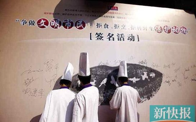 由東莞市文明辦和市林業(yè)局共同主辦的“爭(zhēng)做文明市民,拒食野生保護(hù)動(dòng)物”公益倡議活動(dòng)上周五啟動(dòng),當(dāng)天就吸引了百余家餐飲單位的廚師聯(lián)合簽名拒烹野生保護(hù)動(dòng)物。