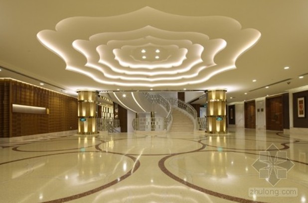 設計師摒棄了傳統高檔餐廳的金碧輝煌,在大廳的設計中將“牡丹”、“祥云”、“浮萍”、“瓦片”等元素運用其中,寄托了對東方文化的無限情感!澳档ぁ敝饕憩F在頂面造型之中,在恢弘的空間中增添了優雅的氣質,烘托清雅閑逸的情境。“祥云”躍然于畫面之上,散發著無限曼妙的意境,富有煙云溟?的意趣,配合地面水波蕩漾的圖案,蜿蜓又悠然自得的神態表現的淋淋盡致,豐富了視覺效果,讓人不禁幻想是徜徉在一望無際的大海之中。中庭的設計將柱子與梁的結構大膽的運用和處理,使空間多了份莊嚴與質樸。傳統房屋中“瓦片”元素的運用更加貼近自然。