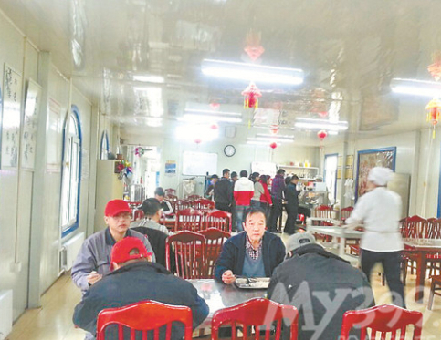 200多平方米的食堂,能容納近百人同時(shí)用餐,在墻上的食譜板上寫著“扣肉、小雞燉蘑菇、菜心燒木耳、土豆絲、柿子炒雞蛋、糖醋黃瓜”,免費(fèi)的綠豆粥已經(jīng)盛在了保溫桶中。兩葷兩素8元錢,米飯給的量足夠20多歲的小伙子吃。