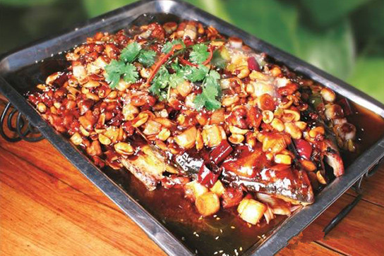 5、凈鍋下一半碗汁熬開、攪濃,起鍋淋到烤魚周圍。6、鍋下底油燒熱,加入干辣椒段15克炸至棕紅色,再放入花椒8克炸香,隨后下蔥丁30克、姜丁8克煸香,倒入雞丁翻炒均勻,烹入剩余的料汁快速翻裹均勻,撒入油酥花生米200克翻勻,調少許油辣椒起鍋蓋到烤魚上,點火上桌即成。