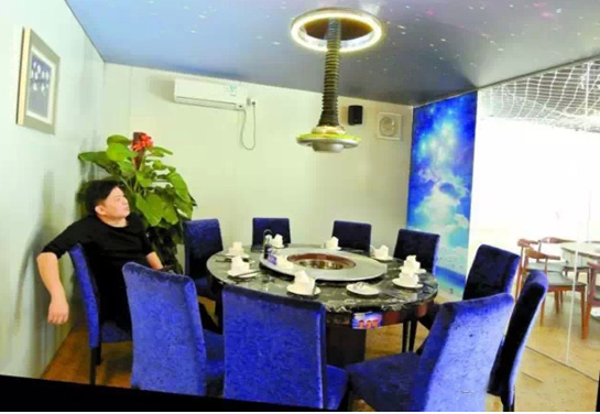 進入餐廳,首先映入眼簾的是頭頂上灰藍的太空和耀眼的星星天幕,最奇特的是有幾只金色的飛碟吊著托盤,托盤上盛滿菜,沿著軌道在“太空”中運轉。當運轉至餐桌上方,飛碟會自己停住,伸下長長的“腰”,將菜送至客人面前。