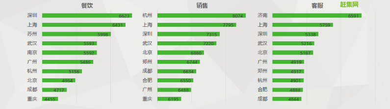 趕集網數據顯示,企業對畢業生需求量最高的行業分別是技工/工人、銷售、餐飲、超市/百貨/零售等服務型行業。國家統計局最新發布數據,2017年全年餐飲收入39644億元。趕集網研究分析,餐飲行業招聘需求一直保持高速增長態勢,企業招聘需求主要集中在南京、武漢、蘇州、深圳、廣州、成都等南方城市。銷售類、客服類人才也十分搶手,新一線城市企業招聘量逐步追上或已經超過一線城市,銷售類人才企業招聘量排名前三位的城市是杭州、上海、深圳,客服類人才企業招聘量排在前三位的是濟南、上海和深圳。這說明,大城市對基礎性服務崗位的需求較大,新一線城市逐漸成為基礎性服務業人才培養的高地。